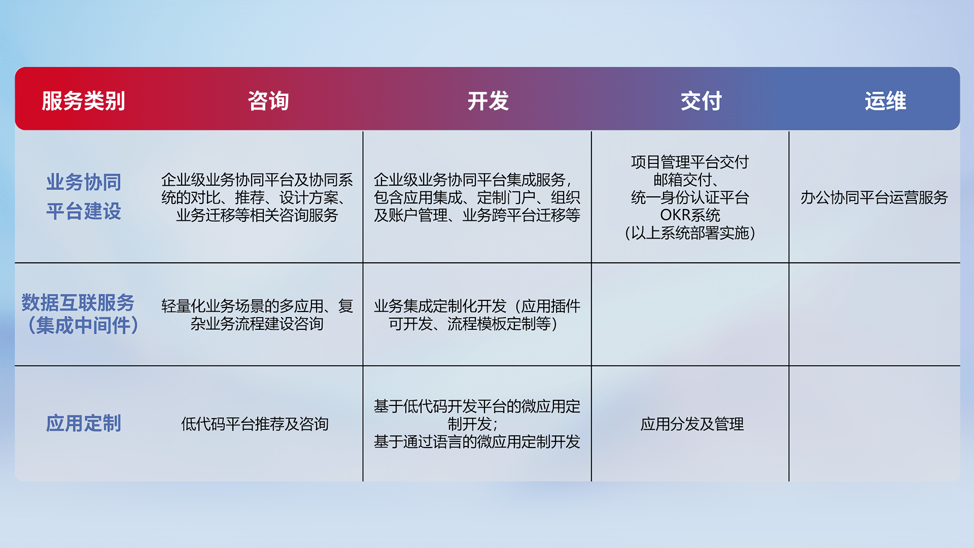 针对钉钉、、、、企微、、、IDaas等平台级产品提供产品的规划、、方案、、、交付、、、、定制化开发等服务,,实现如统一协同办公、、智能客户服务、、、、混合会议管理、、、、智能数据查询、、等业务场景,,实现数字化转型。。。。